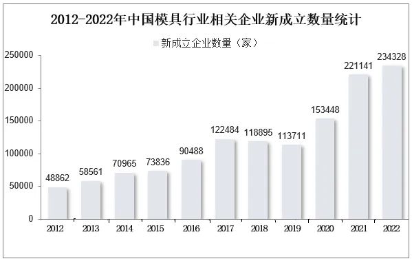 2022年全球模具行業(yè)規(guī)模超過(guò)2.1萬(wàn)億元人民幣,中國(guó)模具行業(yè)市場(chǎng)規(guī)模超過(guò)3200億元人民幣。從行業(yè)競(jìng)爭(zhēng)格局來(lái)看,模具行業(yè)屬于大行業(yè),2012年-2022年,國(guó)內(nèi)模具行業(yè)相關(guān)企業(yè)新成立數(shù)量由48862家增長(zhǎng)到234328家。【本文數(shù)據(jù)、圖表來(lái)源:華經(jīng)產(chǎn)業(yè)研究院、鳳凰網(wǎng)】