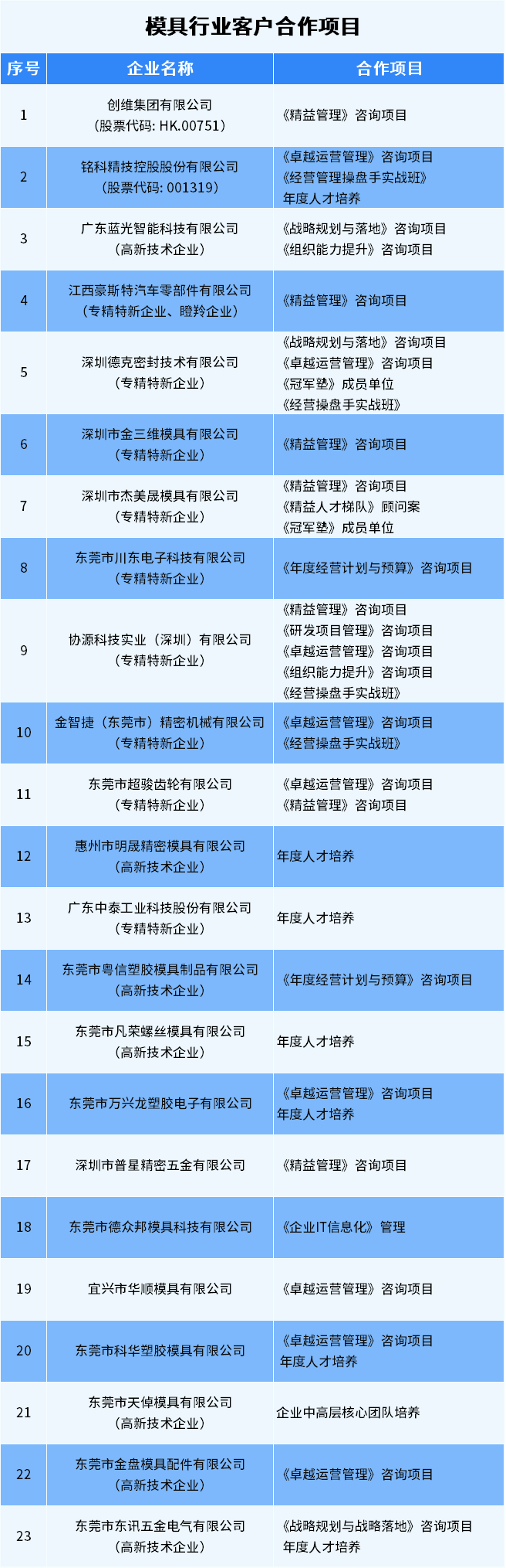 遠(yuǎn)大方略精準(zhǔn)剖析模具行業(yè)發(fā)展現(xiàn)狀和痛點(diǎn),為眾多模具企業(yè)賦能,持續(xù)開(kāi)展針對(duì)性咨詢項(xiàng)目: