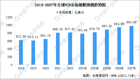 據(jù)行業(yè)知名研究機(jī)構(gòu)統(tǒng)計(jì),2022年全球PCB產(chǎn)業(yè)總產(chǎn)值達(dá)817.41億美元,同比增長(zhǎng)1.0%。隨著新科技應(yīng)用如AI、5G網(wǎng)絡(luò)通信、新能源車等持續(xù)帶動(dòng),預(yù)估未來5年P(guān)CB行業(yè)仍將穩(wěn)步成長(zhǎng)。根據(jù)行業(yè)權(quán)威機(jī)構(gòu)預(yù)測(cè),2022至2027年之間全球PCB行業(yè)產(chǎn)值將以3.8%的年復(fù)合增長(zhǎng)率成長(zhǎng),到2027年將達(dá)到983.88億美元。