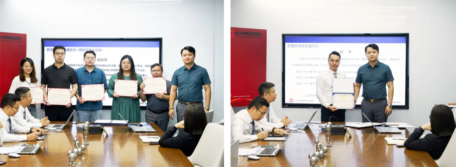 會上,李總為項目老師頒發(fā)了授權(quán)書,為各項目小組負責人頒發(fā)了任命書,共同宣誓投身變革。