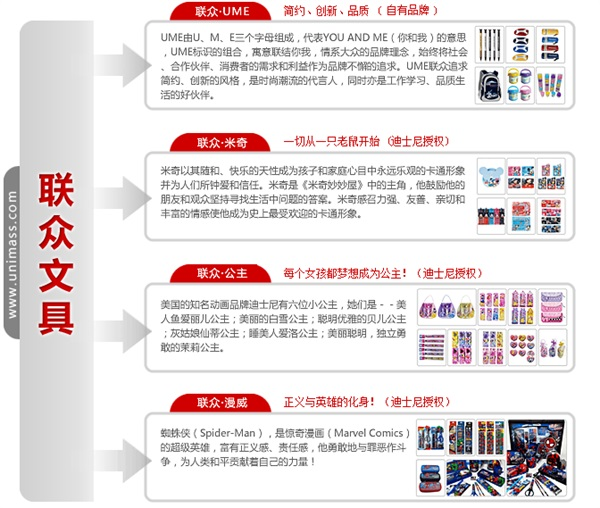廣東聯(lián)眾文具有限公司由現(xiàn)任總裁施紅光先生創(chuàng)辦于1996年。自成立以來,聯(lián)眾公司一直專注于學生、辦公文具及新潮禮品的開發(fā)、設計、制造和銷售。目前,聯(lián)眾公司產(chǎn)品線涵蓋日常事務型文具、書寫工具、彩繪工具、精美套裝禮品、筆袋、筆盒、書包、水壺水杯、毛絨公仔等品類;品牌包括聯(lián)眾UME 系列、聯(lián)眾出奇蛋系列及迪士尼國際授權品牌系列。國內(nèi)營銷網(wǎng)絡已覆蓋國內(nèi)30個省市,并在北京、廣州、上海、南京、武漢、成都、西安、沈陽等八大城市設立了輻射全國的區(qū)域服務平臺。