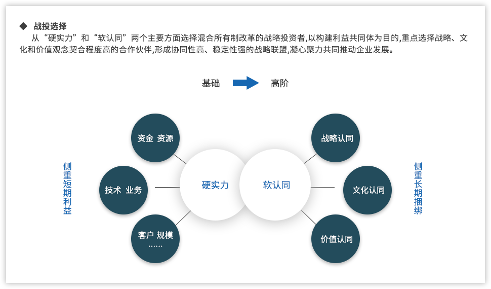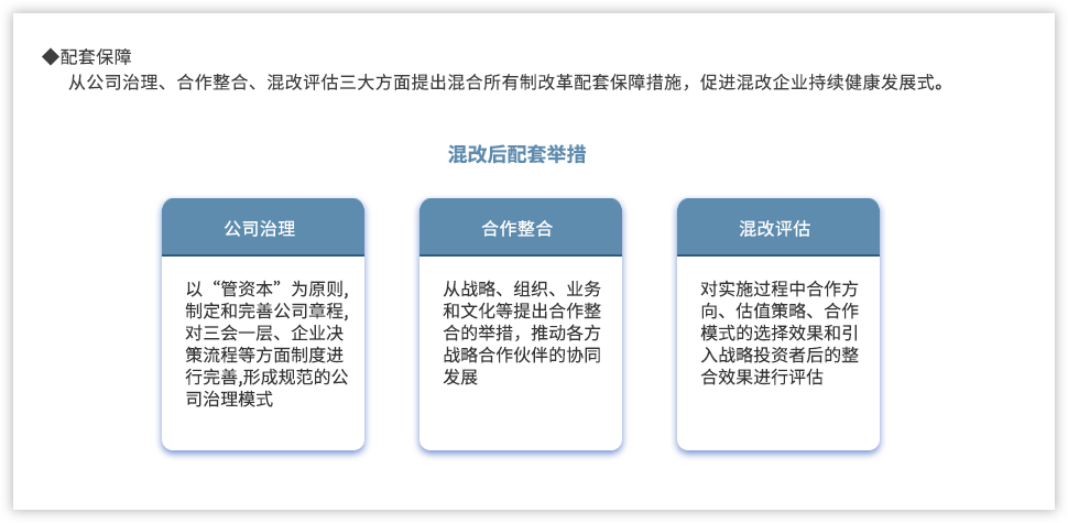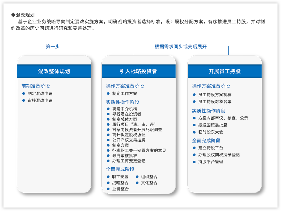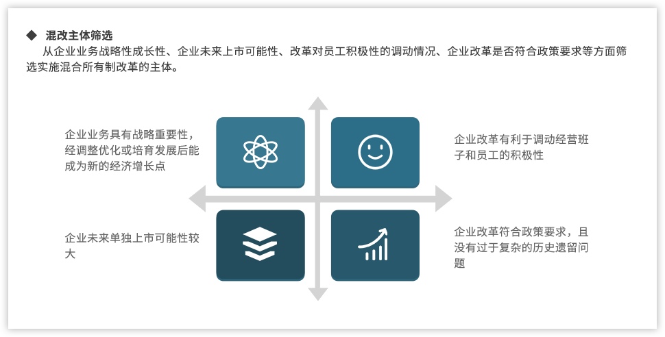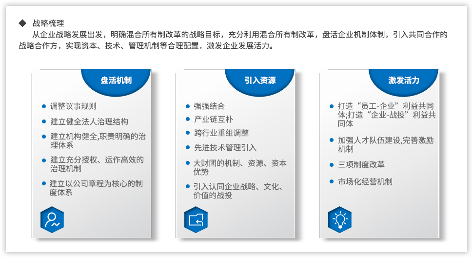 黨的十九大報告指出:“要深化國有企業(yè)改革,發(fā)展混合所有制經(jīng)濟,培育具有全球競爭力的世界一流企業(yè)”;當前,隨著國企改革“雙百行動”、區(qū)域性國資國企綜合改革試驗、“科改示范行動”、第三批以及第四批混改試點的實施,國企改革由點向面梯次鋪開、范圍逐步擴大,并呈現(xiàn)明顯加速,國有企業(yè)改革進入“深水區(qū)”。追本溯源,國企改革到底怎么改,回到國有企業(yè)改革的初衷我們認為,國有企業(yè)改革是以混和所有制為手段,在堅持黨的領導下建立現(xiàn)代企業(yè)制度,優(yōu)化管理關系,創(chuàng)新管理機制,激發(fā)員工活力,從而最終實現(xiàn)國有企業(yè)的持續(xù)發(fā)展?;旄穆鋵嵉骄唧w實踐中,便處處是難點。遠大方略認為,混改的重點已經(jīng)從以“政策研究+方案制定”為主轉變到以化解落地過程中的實際痛點為主,從剖析“為什么混、和誰混、怎么混”轉變?yōu)槁鋵嵵卫斫Y構、戰(zhàn)略協(xié)同以及激勵機制等深層次問題。