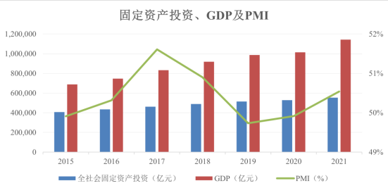 在供需改善的背景下,國內(nèi)制造業(yè)景氣度自 2015 年底起觸底回升。同時(shí)中國工業(yè)企業(yè)設(shè)備能力利用水平、固定資產(chǎn)投資情況自 2016 年開始穩(wěn)步增長,制 造業(yè)景氣度繼續(xù)上行。2020 年受新冠疫情影響,GDP 增速大幅下降,PMI 小幅提高。2021 年在疫情防控常態(tài)化下,內(nèi)需穩(wěn)步恢復(fù)、外貿(mào)快速增長,GDP 增速重回高位,PMI 上升至榮枯分水線之上,顯示出經(jīng)濟(jì)擴(kuò)張的訊號(hào)。