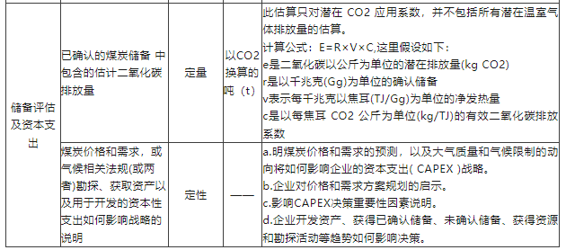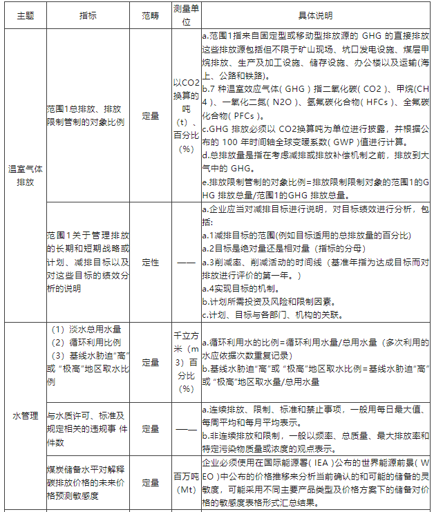 煤炭作業(yè)產(chǎn)業(yè)包括開采煤炭的企業(yè)和制造煤炭產(chǎn)品的企業(yè),開采活動(dòng)分為地下開采和露天開采,開采對(duì)象分為普通煤和原料煤。煤炭行業(yè)屬于資源密集型,作業(yè)過程直接產(chǎn)生較多溫室氣體。該準(zhǔn)則要求相關(guān)企業(yè)在溫室效應(yīng)煤煙排放方面對(duì)溫室氣體排放量進(jìn)行直接披露,并對(duì)企業(yè)短期、長(zhǎng)期的減排計(jì)劃與目標(biāo)按要求進(jìn)行信息披露。對(duì)水資源的管理主要側(cè)重于對(duì)水的循環(huán)利用、合規(guī)利用方面的披露。儲(chǔ)備評(píng)估及資本支出方面?zhèn)戎赜趯?duì)煤炭產(chǎn)業(yè)未來氣候相關(guān)影響的預(yù)測(cè)。此外,針對(duì)煤炭行業(yè)的開采對(duì)象,該準(zhǔn)則還要求對(duì)普通煤生產(chǎn)量(百萬噸)和原料煤生產(chǎn)量(百萬噸)進(jìn)行披露。