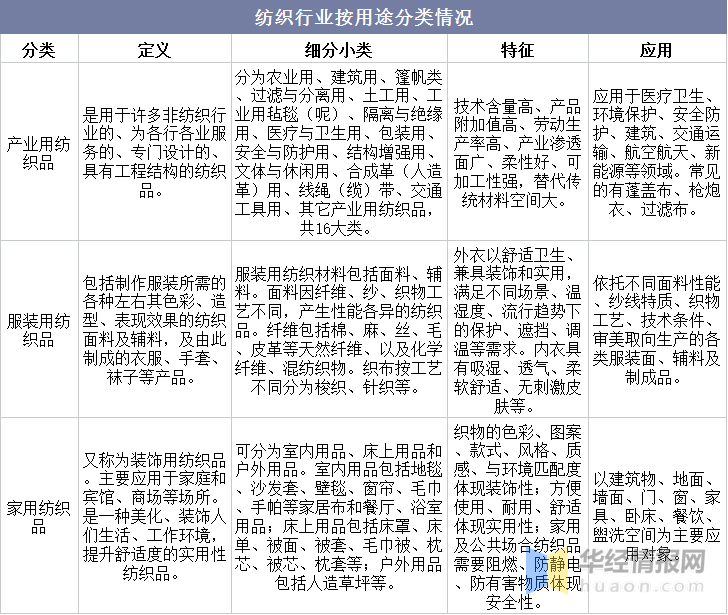紡織行業(yè)按用途可分為產(chǎn)業(yè)用紡織品、服裝用紡織品和家用紡織品三大類,其中產(chǎn)業(yè)用紡織品指的是經(jīng)過專門設(shè)計、具有工程結(jié)構(gòu)特點(diǎn)的紡織品,通常具有柔性好、可加工性強(qiáng)、附加值高、產(chǎn)業(yè)滲透面廣等特點(diǎn),主要應(yīng)用于醫(yī)療健康、日常清潔、環(huán)境保護(hù)、安全防護(hù)、建筑交通、航空航天等領(lǐng)域。按產(chǎn)品加工方式不同,產(chǎn)業(yè)用紡織品可分為非織造、針織、梭織、多層復(fù)合紡織等細(xì)分品類,其中非織造工藝生產(chǎn)產(chǎn)業(yè)用紡織品即為非織造布。