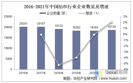 2016至2020年,我國紡織行業(yè)企業(yè)數(shù)量從20201家下降至18344家,2021年有小幅回升,達(dá)18729家,同比增長2.1%。