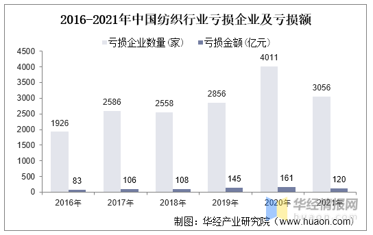我國紡織行業(yè)虧損企業(yè)數(shù)量于2020年達(dá)到近年峰值,為4011家,同比增長40.44%,虧損金額達(dá)到161億元,同比增長11.03%。2021年行業(yè)虧損企業(yè)數(shù)量下降至3056家,虧損金額為120億元。