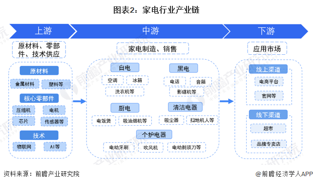 家電產(chǎn)品的生產(chǎn)需要使用金屬、塑料等原材料和各類電子元器件、壓縮機、電機、芯片等零部件,按照產(chǎn)品設(shè)計方案和一定的工作流程對上述原材料和零配件進行加工、組裝,產(chǎn)出產(chǎn)品后通過一定的銷售渠道銷售給客戶。隨著智能家電的發(fā)展,家電行業(yè)對于上游物聯(lián)網(wǎng)、人工智能等技術(shù)需求也在增長,新技術(shù)正在塑造新的家電產(chǎn)業(yè)鏈。