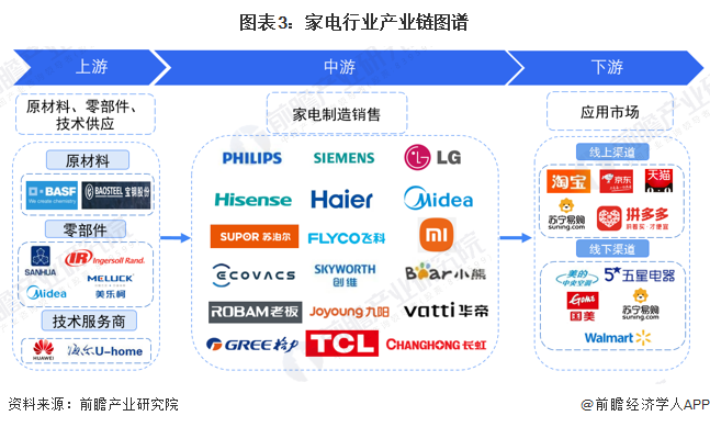 中國家電行業(yè)上游主要參與者包括原材料供應(yīng)商、零部件供應(yīng)商和技術(shù)供應(yīng)商,原材料供應(yīng)商代表性企業(yè)有鋼鐵企業(yè)寶鋼、塑料產(chǎn)品供應(yīng)商巴斯夫等,零部件供應(yīng)商有三花智控、美樂柯等,技術(shù)供應(yīng)商包括華為等;中游家電行業(yè)代表性企業(yè)有美的、格力、海信、海爾、蘇泊爾、創(chuàng)維、科沃斯等;下游銷售渠道主要包括淘寶、京東等電商平臺,也包括蘇寧易購等家電專賣店、美的等品牌的專營店、沃爾瑪?shù)瘸星馈?/p>
