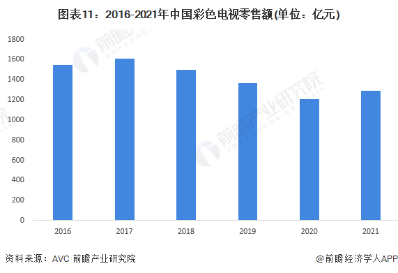 從彩電的零售額看,2016-2021年呈現(xiàn)波動下降趨勢,2017年達到最高值為1609億元,2018年以來一路下降,2021年彩電零售額為1289億元,較2020年增長6.6%。