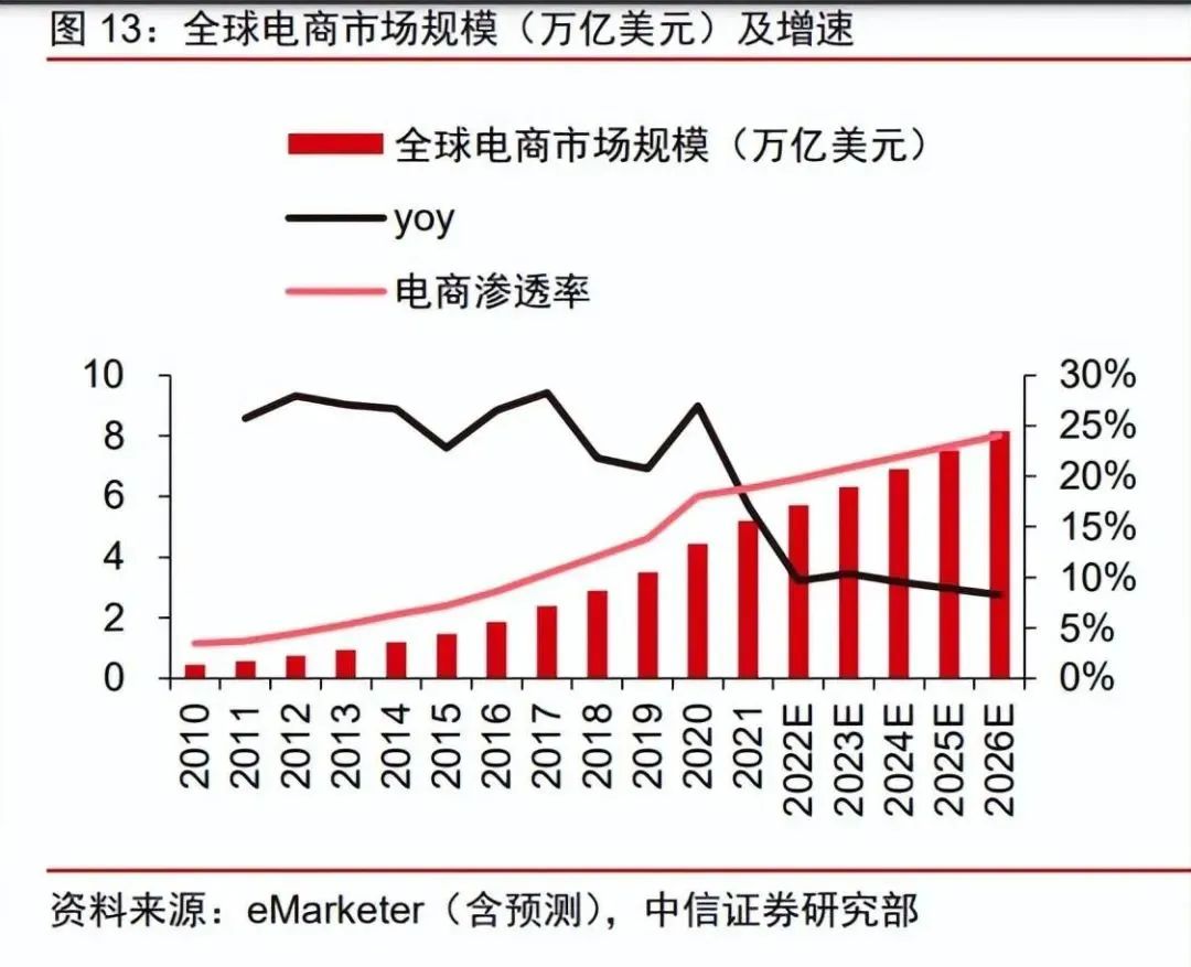 疫后消費線上化趨勢延續(xù),2026 年全球電商滲透率有望達 24%。疫情加速培育全球用戶電商消費習慣,根據(jù) eMarketer,全球電商市場規(guī)模 2019-2021 年 CAGR 為 22%。盡管全球疫情已進入常態(tài)化防控階段,但消費者線上購物的習慣仍然得以保持,根據(jù)相關數(shù)據(jù)顯示,疫情后依然會偏好線上購物的用戶數(shù)在不同品類提升 5%-15%。消費線上化趨勢下,根據(jù) eMarketer,預計 2026 年全球電商市場規(guī)模有望達 8.1 萬億美元,2022-2026 年 CAGR 為 9%,2026 年全球電商滲透率有望達 24%。