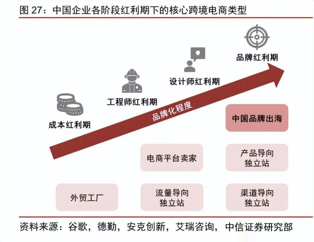 早期,憑借國內(nèi)的勞動力優(yōu)勢,中國制造的高性價比產(chǎn)品快速打開海外市場,但也帶 來了消費者價格敏感、用戶粘性及心智較差等問題。經(jīng)過二十余年發(fā)展,隨著我國跨境電商模式的逐漸成熟、產(chǎn)業(yè)鏈布局的逐漸深入,以及行業(yè)競爭的日益激烈,國內(nèi)跨境電商賣家正在實現(xiàn)從中國制造到中國品牌的升級,以提升消費者心智并強化議價能力。