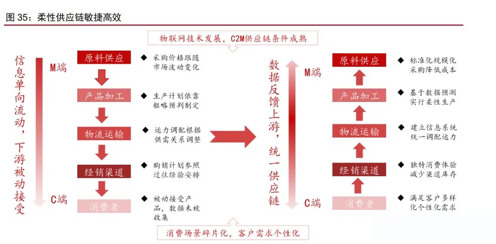 柔性供應鏈高度敏捷,更快捕捉趨勢性機會。中國供應鏈高度靈活敏捷,對傳統(tǒng)供應 鏈的數(shù)字化賦能、消費者數(shù)據(jù)的沉淀以及逆向反饋使得工廠具有按需生產(chǎn)的能力,大幅降 低商家?guī)齑婧统杀緣毫Γ?ldquo;小單快反”的模式也能幫助商家更快地捕捉趨勢性機會。以柔性供應鏈的極致踐行者 Shein 為例,根據(jù) Zara 財報及晚點 LatePost,Shein 從收到訂單 到產(chǎn)品出廠/庫存周轉天數(shù)只需 5/30 天,生產(chǎn)及周轉效率明顯高于 Zara、H&M,而生產(chǎn)成 本僅為 Zara 的 30%-50%。