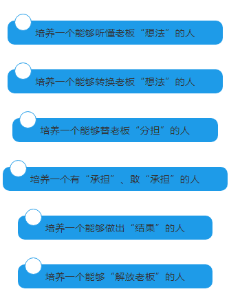 讓老板走出去,花更多的時間去研究市場、研究產(chǎn)品方向。讓操盤手具有自主經(jīng)營意識思維的人,不管老板在與不在公司,都能讓企業(yè)正常運(yùn)營,推動處理跨部門的事情;為將來企業(yè)做大做好準(zhǔn)備;使公司戰(zhàn)略可真正的落地執(zhí)行。通過訓(xùn)練,提升操盤手解決問題的能力、系統(tǒng)思維能力與實(shí)戰(zhàn)運(yùn)營能力。